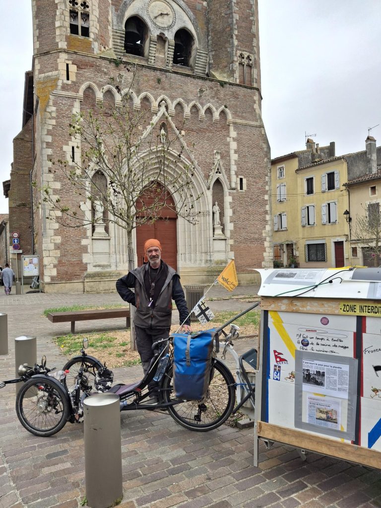 Nous avons eu la belle surprise de rencontrer Hervé Ridard, originaire de Bretagne, sur son tricycle couché tractant une petite roulotte lui servant d’habitation.