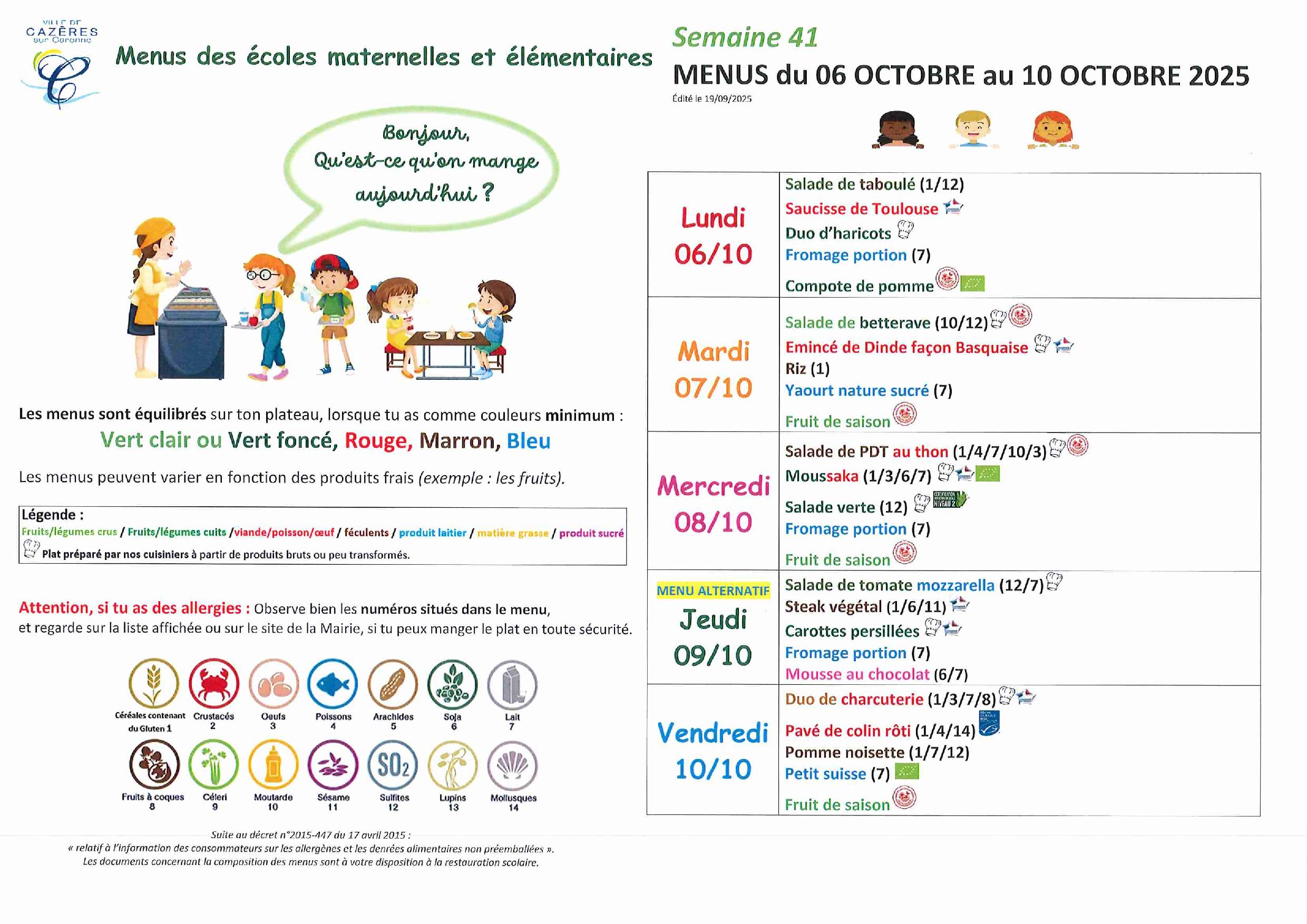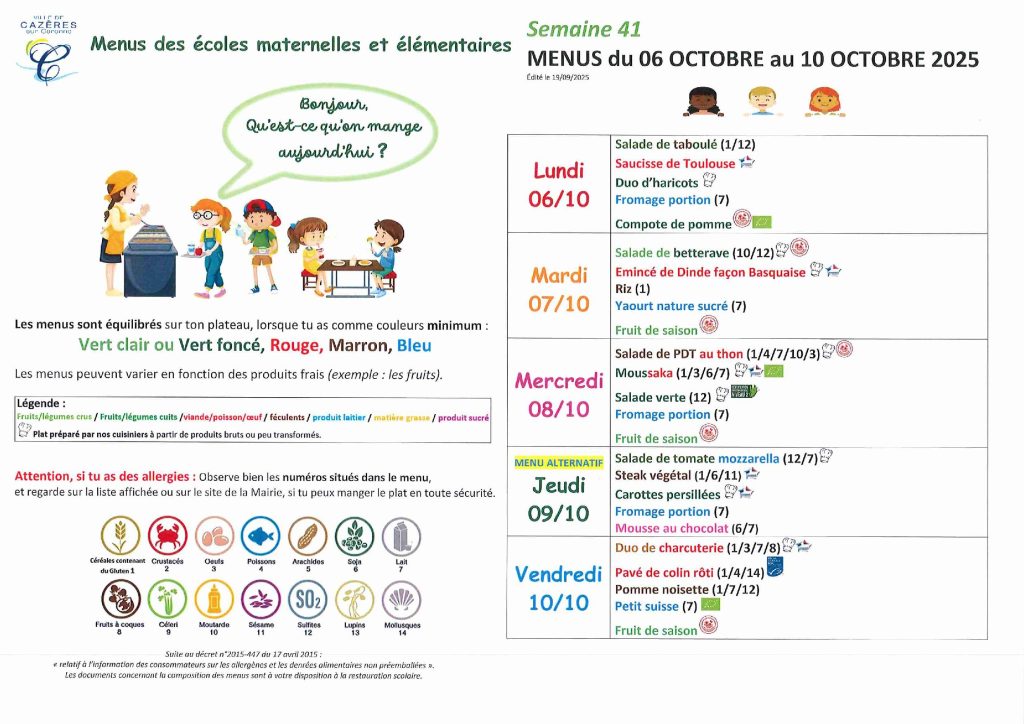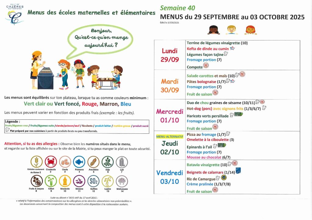 Il appartient donc aux parents de consulter régulièrement les menus en ligne afin de prendre connaissance des éventuelles modifications.Communication du 2 octobre 2025 : Pour aujourd’hui, modification sur l’entrée ce sera potage de légumes au lieu de pizza. Si la livraison ne se fait pas avant 11h30 glace à la place de la mousse au chocolat.