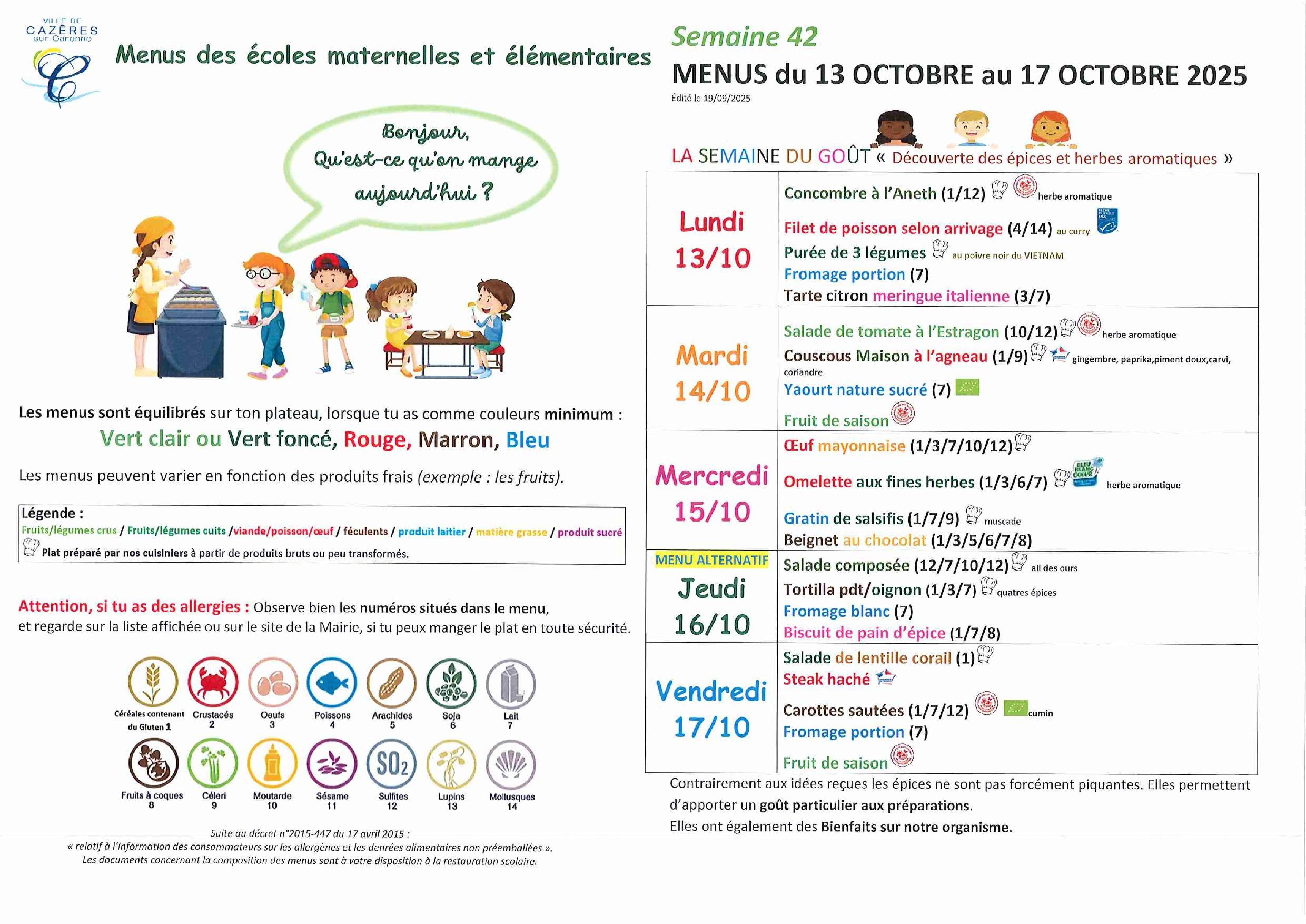 ATTENTION ! à compter du 1er septembre 2025, les menus seront publiés 1 à 2 semaines à l’avance. Certains plats pourront comporter la mention « ?? » en attendant la confirmation des allergènes. Les informations manquantes seront complétées dès la réception des denrées par la cuisine centrale.