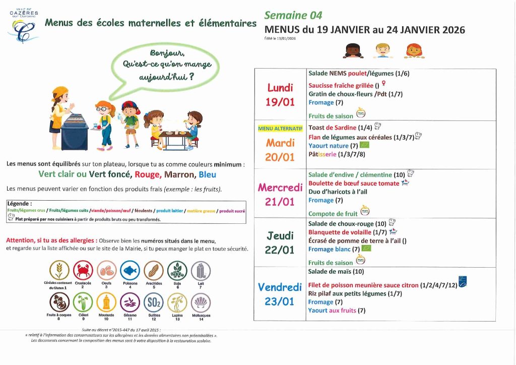 Nous attirons également votre attention sur le fait que, pour des raisons liées à l’approvisionnement, des modifications des menus initialement prévus peuvent survenir. Dans ce cas, une communication spécifique sera effectuée.
