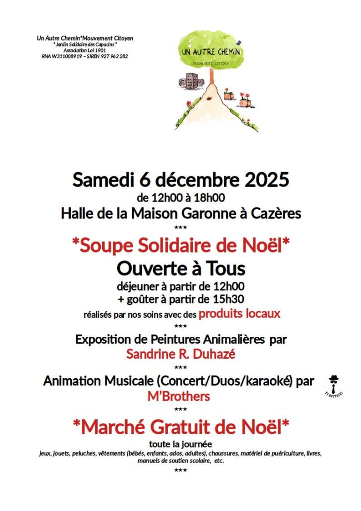 L’association Un Autre Chemin * mouvement citoyen vous invite à partager un moment chaleureux et convivial autour d’une soupe solidaire et marché de Noël !