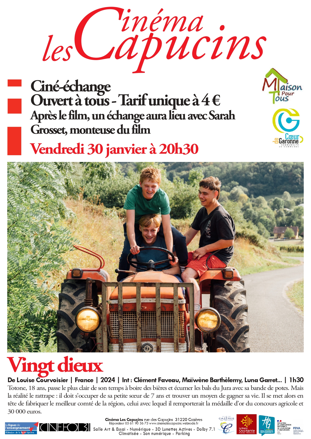 Vendredi 30 Jan. 2026 Ciné-échange « Vingt dieux » À partir de 20h30 Le 30/01/2026 Tarif unique à 4€ Cinéma des Capucins Ouvert à tous