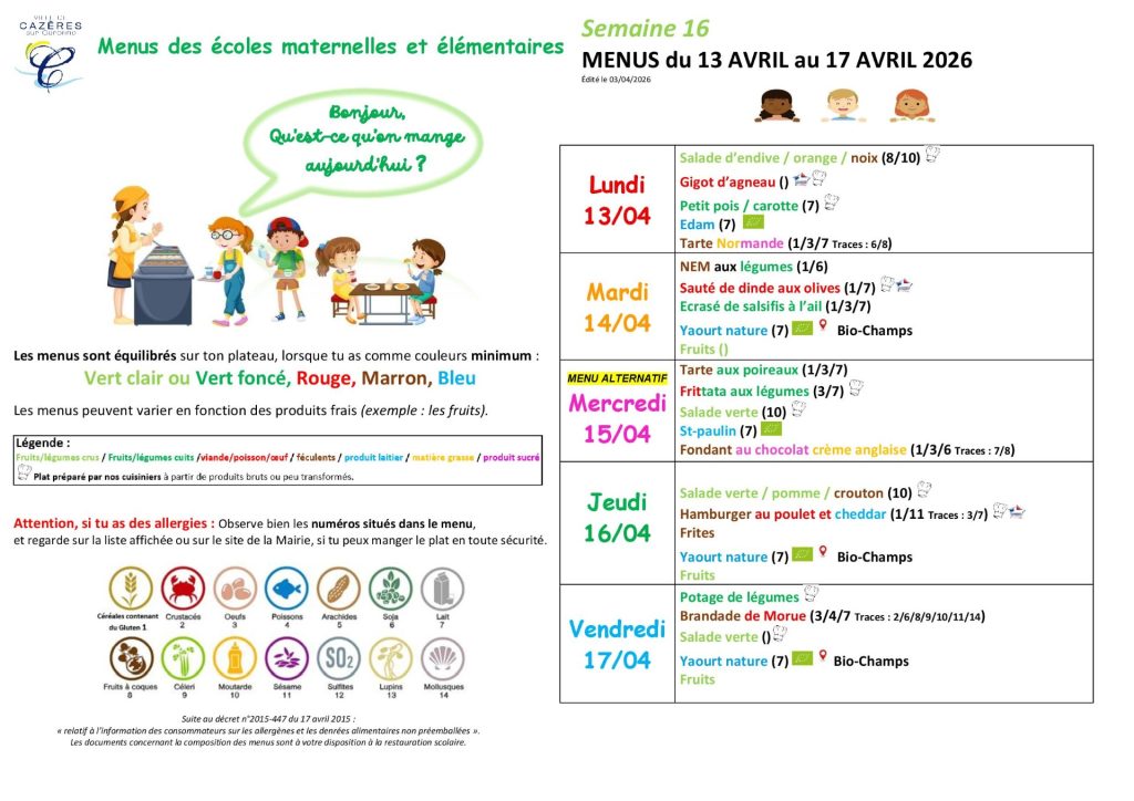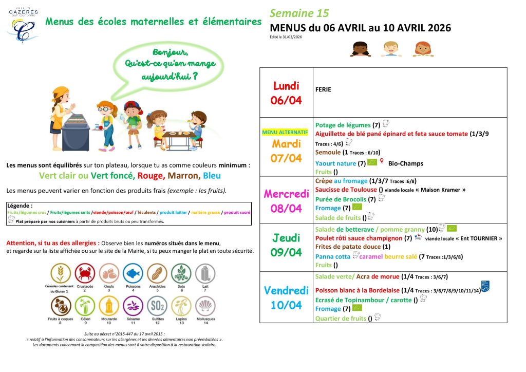ATTENTION ! à compter du 1er septembre 2025, les menus seront publiés 1 à 2 semaines à l’avance. Certains plats pourront comporter la mention « ?? » en attendant la confirmation des allergènes. Les informations manquantes seront complétées dès la réception des denrées par la cuisine centrale.
