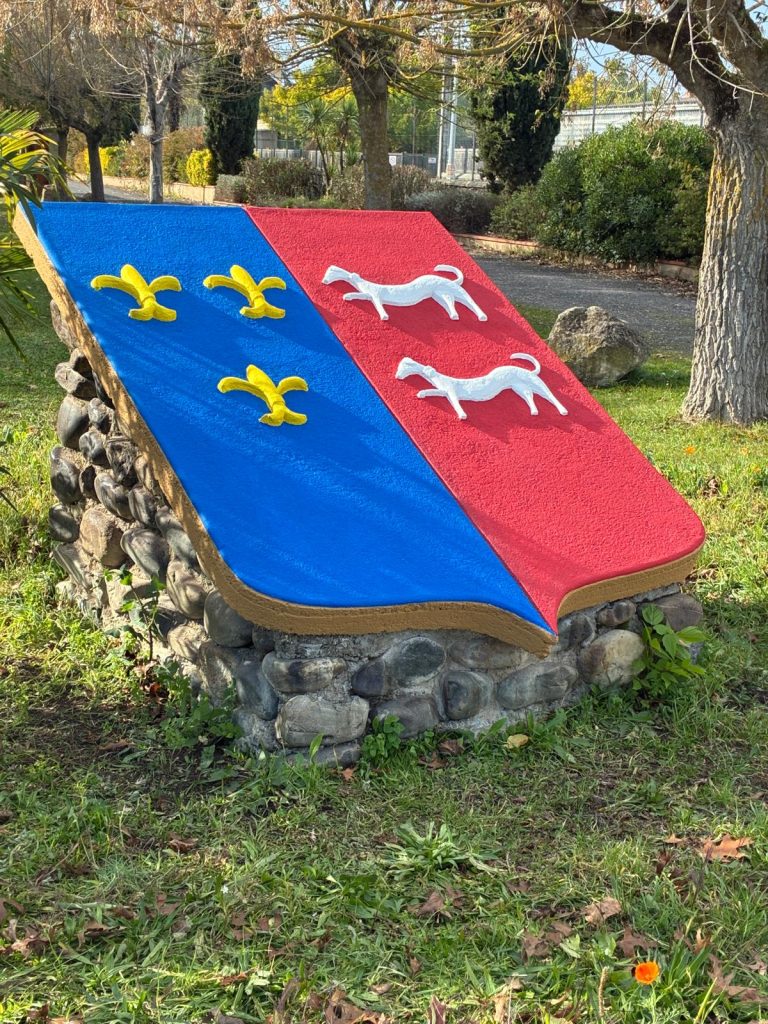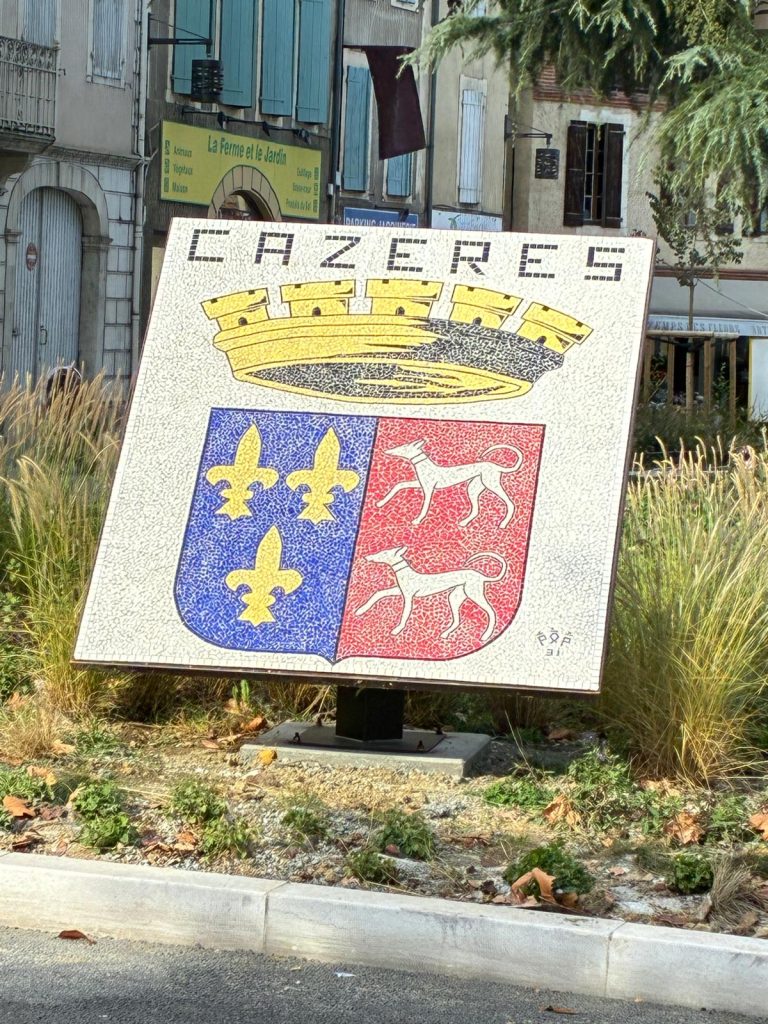 Nous profitons de la rénovation de l’écusson devant le Stadium des Capucins — et du retour de l’écusson ainsi que du buste de Jean Jaurès sur le rond-point — pour vous raconter l’histoire de l’écusson de Cazères représentant un champ d’azur avec trois fleurs de lys et deux levrons (jeunes lévriers).